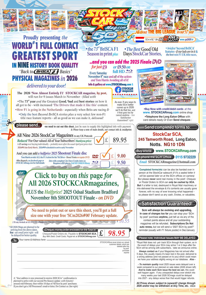 •Every page made as good as we can make it to give you an un-matchable collectable quality permanent physical record of the best of 2026 British & NL StockCar racing delivered to any UK postcode (see www.Go2ASF.nl for benelux), 2026#01 due Early March, 2026#09 end October/early November.